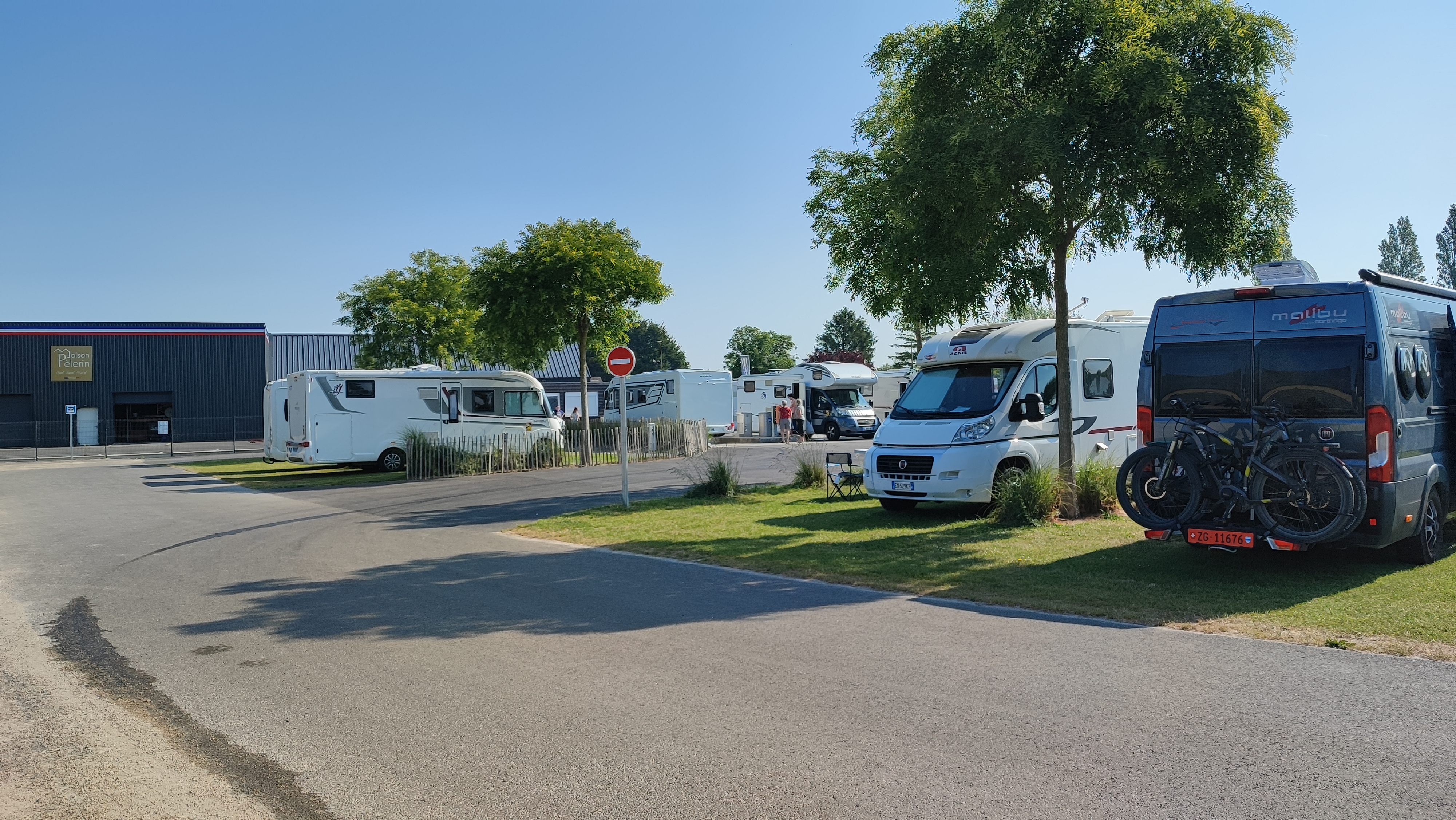 Waouu une digne de 5 étoiles : propre, pelouse coupée comme u tapis, emplacement privatif, eau potable et pizza à emporter . .. à 5km de Mont St Michel par lz veloroute accolée au parking