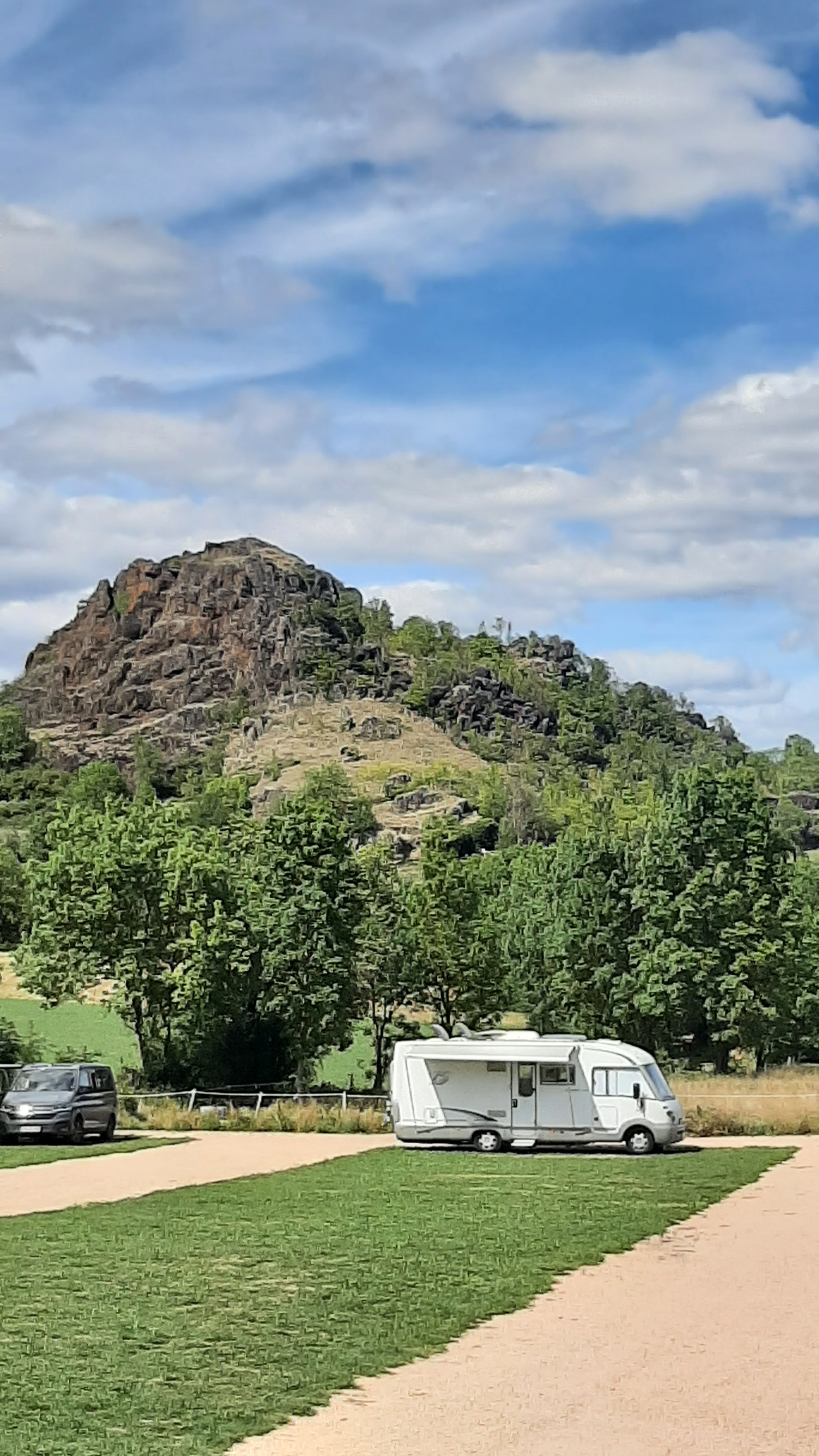 Si on exclu la pente (mais il suffit de caler), c'est parfait. Places sur pelouse, très belle vue tout autour, au calme...
