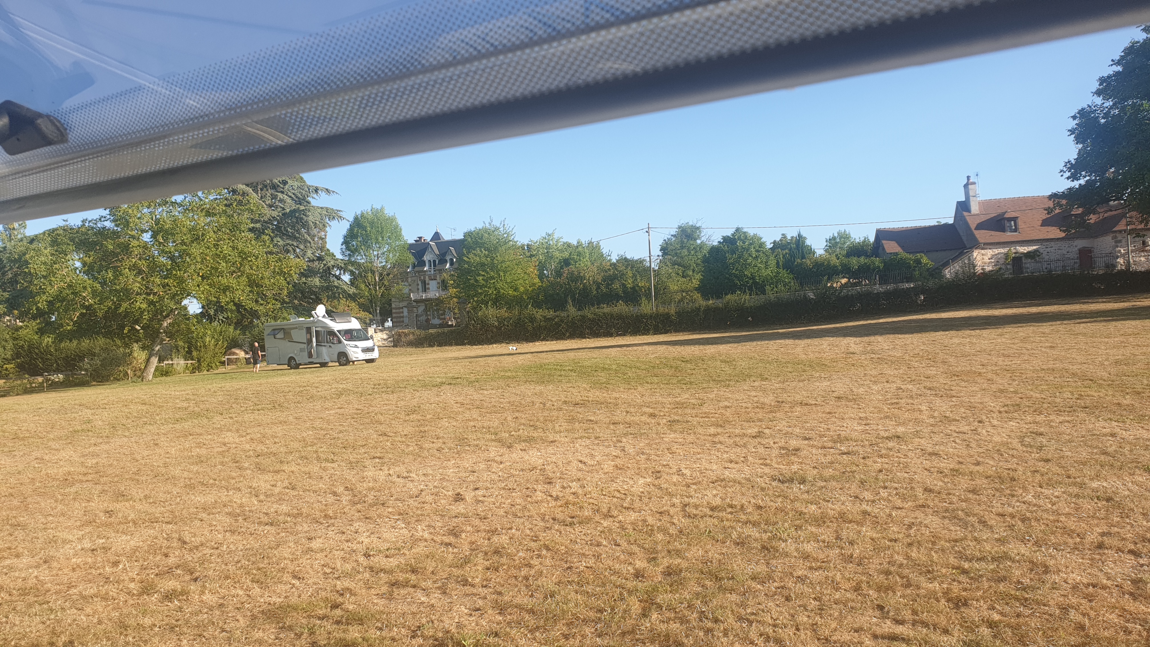 Parking légèrement en pente mais il est possible de se garer sur la pelouse. Eau ou électricité 2€. Vidange eaux grise et noire ok