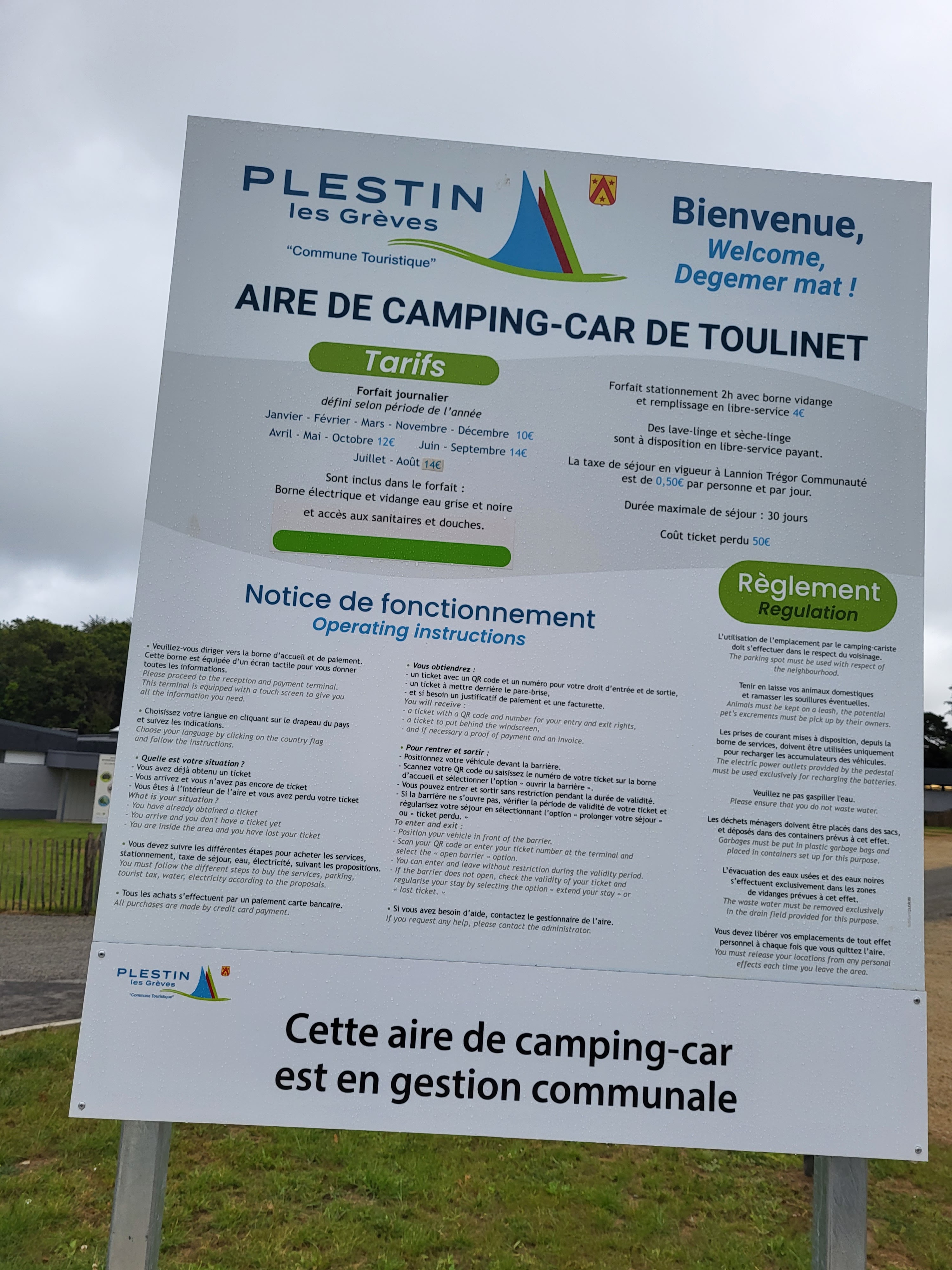 Très belle aire proche de la mer,d'un côté plage à 10mn à pied , de l'autre très belle balade le long de la corniche sur le gr 34 il manque juste quelques indications pour trouver le bon sentier à la sortie de l'aire mais je pense que c'est juste un manque de temps et que cela va ce faire très bientôt .Trop d'arbres on reçoit pas de télé et manque de soleil en mi saison , pas assez d'arbres on manque d'ombre l'été ,pas facile de contenter tout le monde 😁 pour moi c'est très bien 12 euros plus 1 euro 50 pour l'accès au sanitaire si on l souhaite je trouve très correct vu l'aménagement effectuer. Beaucoup de communes sur la côte Atlantique devraient prendre exemple sur vous,surtout dans le sud de la France . Merci à vous.