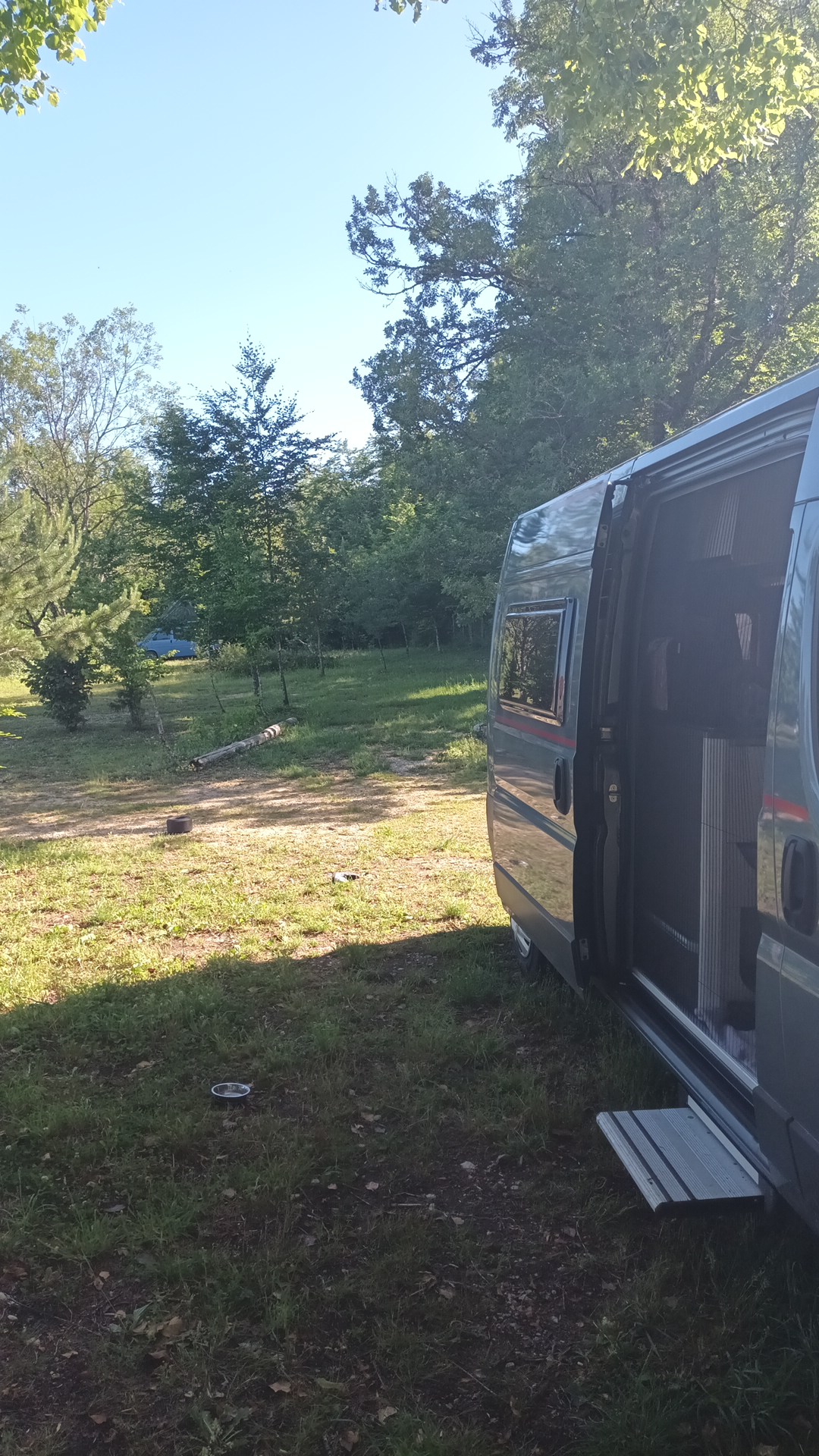 Un endroit extrêmement calme dans une ferme entièrement clôturée avec chèvres, poules, cochons... Grand domaine très ombragé. J'ai passé une nuit idéale et j'ai merveilleusement dormi. Pas d'installations, seulement des poubelles. 7 euros la nuit. À distance de marche d'un grand lac. Un berger allemand veille sur la propriété et vient régulièrement saluer les campeurs. Chien super doux😁😁