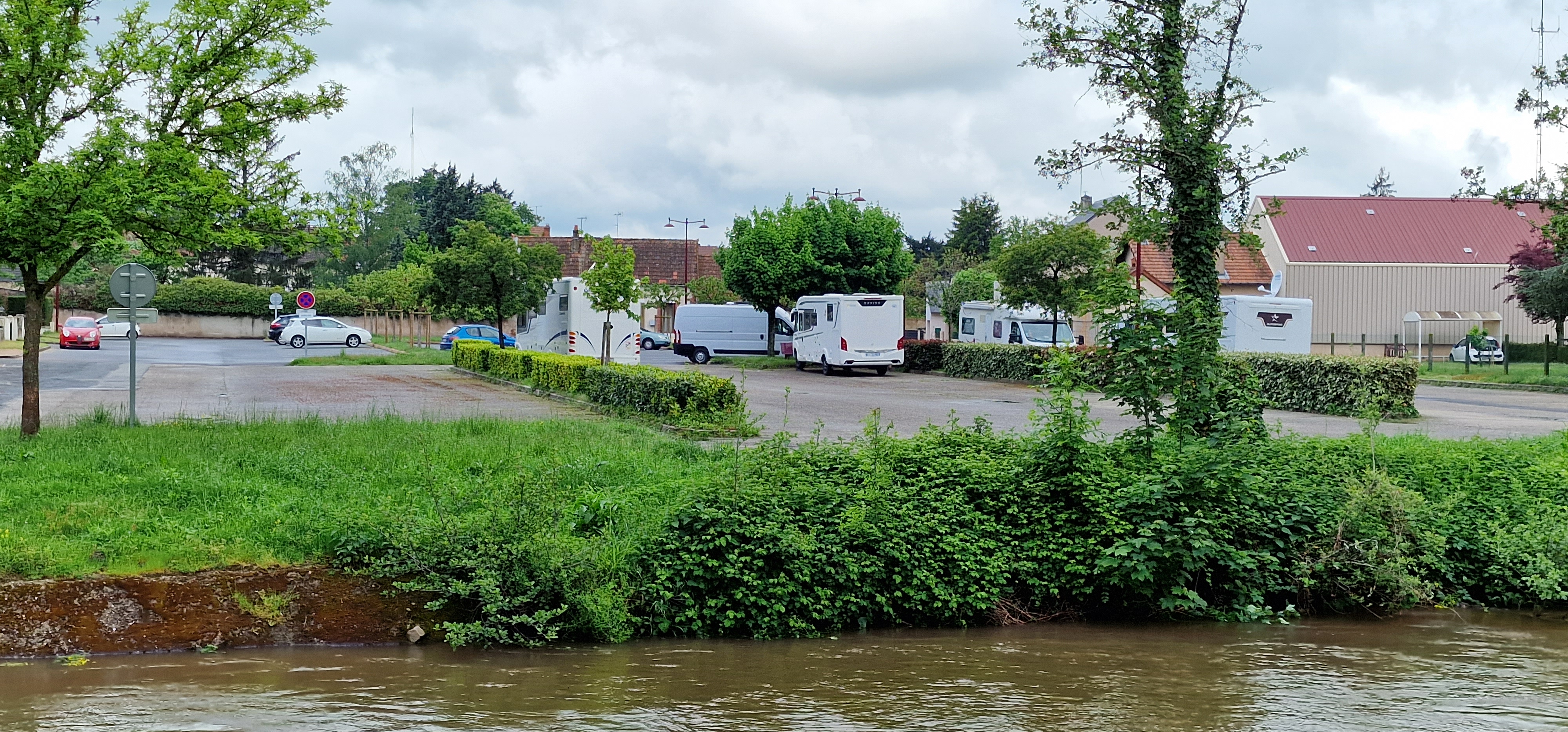 Super calme et belle place de parking au bord de la rivière au milieu de Lapalisse. Élimination possible, eau désormais fermée en hiver ainsi que les toilettes ! Toujours heureux sur la route vers le sud.